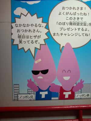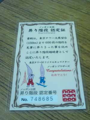東京タワーを歩いて登ったら、こういう認定証をもらえます。ノッポンが公認してくれるみたいですが、このイラスト、今と比べてずいぶんと細長い……